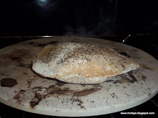 - Slide onto on pre-heated baking stone for 5-7 minutes. The pita will be puffed up and slightly brown